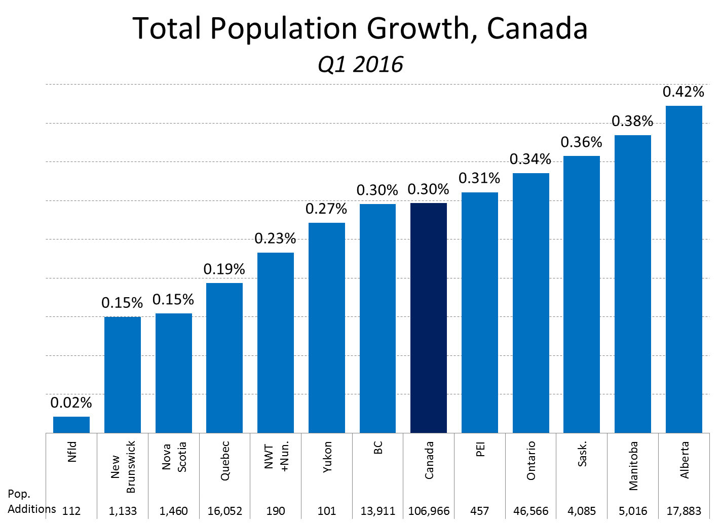 Each province and territory in Canada added population during Q1 2016, with the national population rising by 0.30% through the addition of almost 107,000 people. While almost half (44%) of the additions were in Ontario, it was the prairie provinces leading the way in growth, with Alberta sporting a 0.42% growth rate. Interestingly, Alberta added almost 18,000 people in Q1 2016--more than both Quebec (16,000) and British Columbia (14,000), each of which boast larger populations than Alberta.